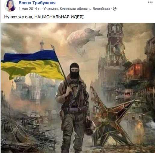 А здесь делится своим видением национальной идеи. Как раз накануне сожжения людей в Одессе. Про это, кстати, «журналистка» молчит как рыба об лёд. Видимо, пребывая в мире собственных фантастических реалий, запечатлённых на снимке.