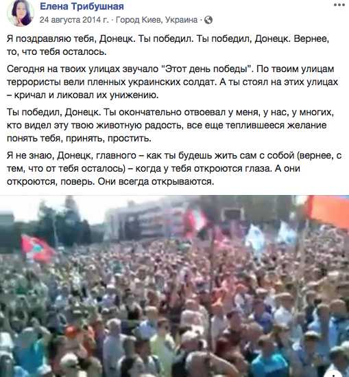 А потом её столица шахтёрского края сильно огорчила – это когда украинских вояк по улицам водили. Про авианалёты, бомбёжки и артобстрелы пани Елена не пишет, а вот «воины света» на донецких улицах её так задели, что даже желание пропало «понять и простить» Донецк.