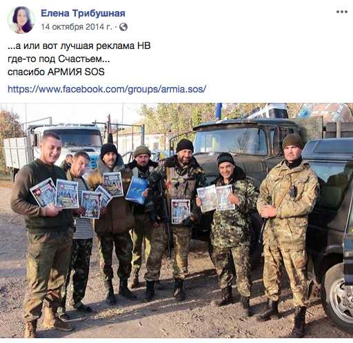 А это реклама журнала «Новое время», и замредактора выражает благодарность… ой, а не лица ли из батальона «Шахтёрск» это, который впоследствие стал «Торнадо» – сборище маньяков, убийц, насильников и грабителей, деяниям которых в Донбассе поражался даже главный военный прокурор? Но пани Елена им горячо дякувала.