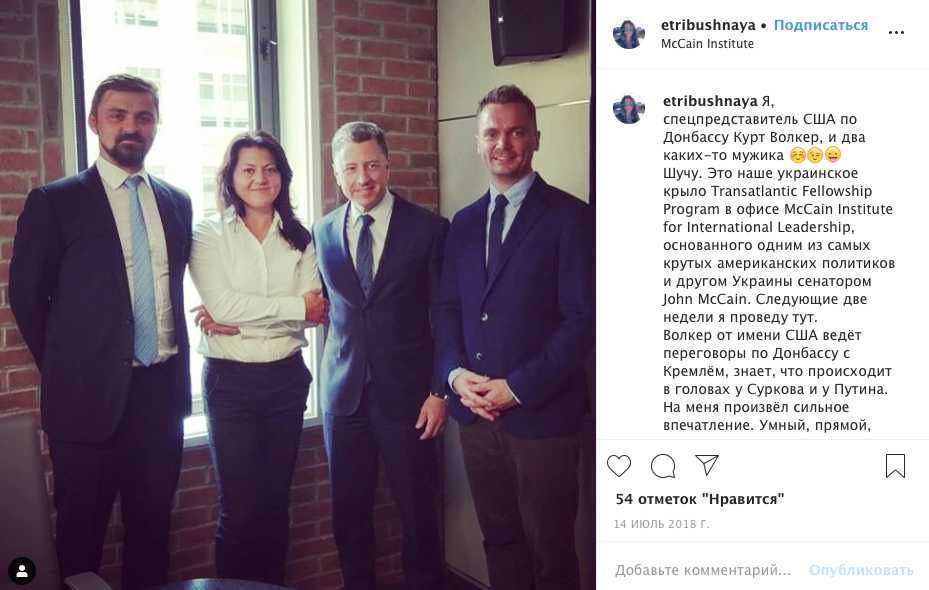 А здесь пани Елена восхищается «другом Украины» Джоном Маккейном (ныне покойным) и бывшим спецпредставителем США по урегулированию конфликта в Донбассе Куртом Волкером – тем самым, который поспособствовал поставкам ПТРК «Джавелин» Киеву.