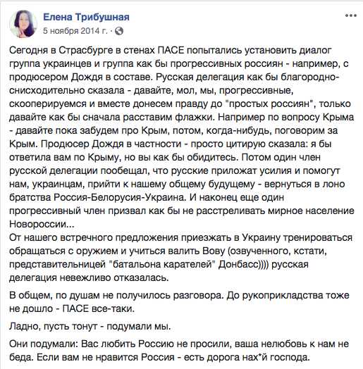 А здесь пани Трибушная снова разочарована – на сей раз россиянами в ПАСЕ, которые не стали отвечать на вопрос «Чей Крым?» и призвали «как бы не расстреливать мирное население Новороссии». То самое, которое она нынче собралась возвращать через телевизор в украинские «реалии».