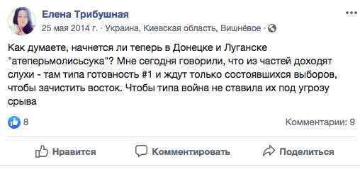 Кстати, знаковый такой пост – как раз накануне первых авианалётов на Донецк. И слово «война» уже присутствует в тексте, то есть панночка была в курсе, что собираются воевать и «зачищать». И ничего её не беспокоило, нигде не жало ей использование Киевом армии против Донецка и Луганска.