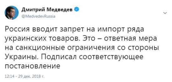 Под конец года Киев наконец-то дождался настоящих санкций от Москвы. Спустя два дня после того как украинский Кабмин 27 декабря расширил список запрещенных к ввозу российских товаров (добавили всего-навсего крахмал, глюкозу и мальтодекстрин), премьер-министр РФ Дмитрий Медведев ввел эмбарго на импорт целого ряда не только украинских, но и провозимых через территорию Украины товаров.