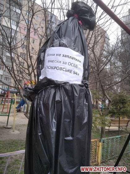 Фото факт. В Житомире решили таким вот образом выбить долги из нерадивых жильцов. Ну а чтобы понятней было – разместили ЭТО на детской площадке.