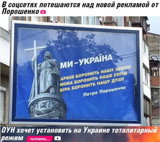 Своеобразной квинтэссенцией предвыборной политики Порошенко стал тщательно продуманный пиарщиками лозунг, который появился незадолго до празднования юбилея Крещения Руси. На билбордах на фоне памятника Владимиру Великому, сооружённому при российском императоре Николае I, красуется лозунг за подписью Порошенко: «Мы – Украина. Армия защищает нашу землю, язык защищает наше сердце, вера защищает нашу душу». Этот лозунг является свидетельством того, что Порошенко намерен продолжать войну в Донбассе, продолжать наступление на русский язык и на каноническое православие.