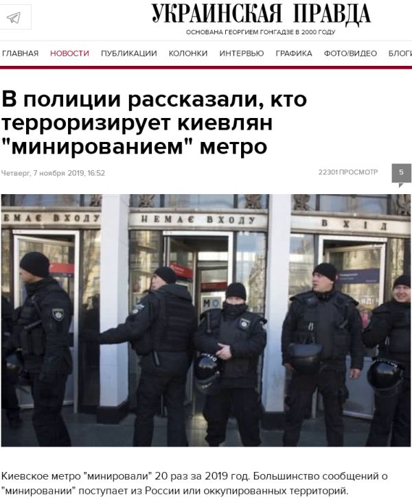 Естественно, подобное бывало и раньше. Но никогда не происходило с такой регулярностью. Ещё одно важное отличие в том, что прежде «телефонных террористов» быстро вычисляли. Обычно это оказывались люди, которое так своеобразно шутили в пьяном виде. Благо телефон сейчас у каждого под рукой. Порой метро «минировали» люди, имеющие психические расстройства. Выйти на след таких «горе-террористов» для полиции не составляло труда. Сейчас совсем другое дело. И в МВД заявляют, что «большинство этих звонков и писем о минировании поступает из России или с неподконтрольных территорий Донбасса», но есть большие основания сомневаться в этом. Ведь количество случаев «минирования» метро и железнодорожных станций резко возросло именно после того, как усилилось противостояние президента Зеленского с украинскими националистами.