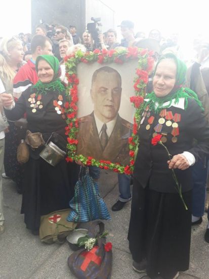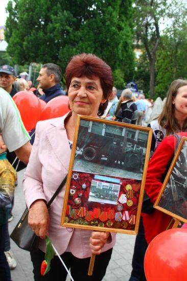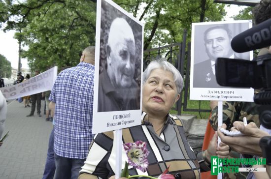 Люди имели возможность пронести по городу фотографии своих родственников-героев. И гордились ими. Так, Татьяна Николаевна Давидович держала сразу два портрета - свекра Александра Давидовича и отца Николая Глинского. Они оба воевали и прошли войну.