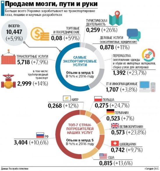 Еще одна заметная статья экспорта – давальческие схемы, когда из иностранного сырья или деталей, а зачастую и на иностранном оборудовании, дешевые украинские «руки» собирают продукцию для заказчиков в Германии, Польше и Венгрии. В основном это одежда, обувь, химия, автопром, мебель. «Производство по давальческим схемам надо развивать, так как это рабочие места, стабильные зарплаты и отсутствие проблем для наших производителей со сбытом продукции», - считает президент "Украналитцентра" Александр Охрименко. Правда, полностью заменить главный источник валютных поступлений от экспорта услуг ни IT, ни авиация, ни давальческие схемы пока не могут. А с ним у Украины проблемы.