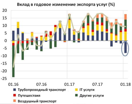 Основные драйверы роста в начале 2018-го – авиационный транспорт (+33,9%) и IT-сфера (+57,8%). А вот трубопроводный транспорт заметно сдал (-29,9%) из-за теплой погоды в Европе и, соответственно, падения объемов прокачки российского газа через украинскую газотранспортную систему (ГТС).