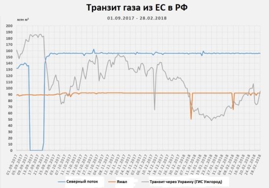 В январе-феврале 2018-го «Газпром» поставил в Европу через ГТС Украины всего 11,33 млрд. кубов, что на 28,3% меньше, чем в январе-феврале 2017-го. Если экстраполировать эту цифру на будущее и учесть, что в прошлом году прокачка российского газа принесла Украине $3 млрд., то к концу года «Нафтогаз» недосчитается около $0,85 млрд. доходов, заместить которые нечем. В начале марта «Укртрансгаз» зафиксировал 30%-ный всплеск объемов российского транзита, но это связано с аномально холодной погодой в Европе и вряд ли можно считать устойчивой тенденцией.
