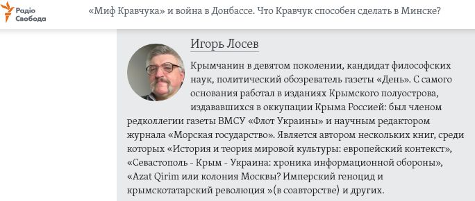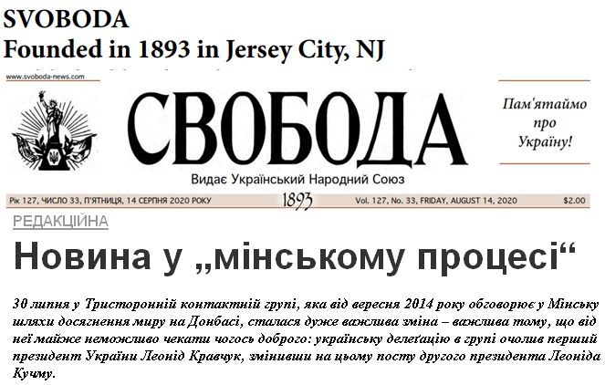 «В Трёхсторонней контактной группе, – пишет «Свобода», – произошло очень важное изменение – важное, потому что от него невозможно ожидать чего-то хорошего: украинскую делегацию в группе возглавил первый президент Украины Леонид Кравчук... Один из руководителей Коммунистической партии Украины в последние годы СССР, Кравчук руководил наивреднейшим для сознательного (в оригинале – «свідомого». – С.Б.) украинства отделом агитации и пропаганды. Именно как главный идеолог Центрального комитета КП Украины ревностно защищал советскую систему...