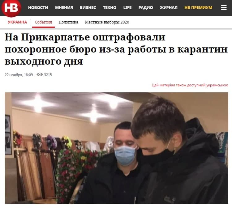 Умирать, не нарушая карантин. В попытке выполнить все требования карантина выходного дня доходит и до курьёзов. В Прикарпатье было оштрафовано похоронное бюро, которое работало в выходные дни, нарушая карантин. Однако после того, как владелец ритуальной службы написал в социальных сетях: «Люди, я вас прошу – не умирайте в выходные, дождитесь понедельника!», штраф отменили.