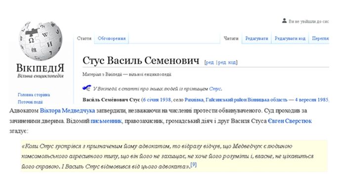 Как видим, «Свобода» настолько ненавидит Медведчука, что ради этой ненависти даже на время перестала демонизировать советскую власть. Ведь в статье чёрным по белому написано, что именно Виктор Медведчук, пусть даже и угождая советской власти, виноват в том, что Василий Стус «снова попал в тюрьму и в новую ссылку». Значит, по этой логике защищал бы Медведчук Стуса более принципиально или попался бы Стусу другой адвокат, то поэт не попал бы «в тюрьму и в новую ссылку».