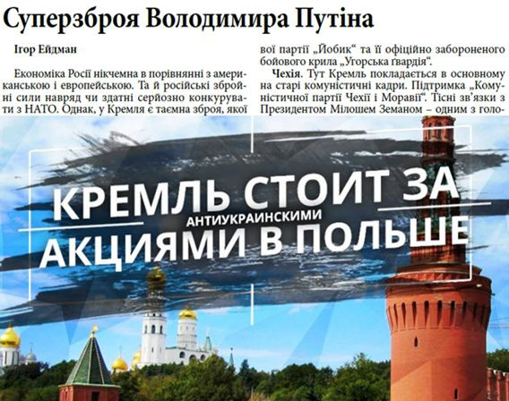 В № 14 газеты «Свобода» в статье «Сверхоружие Владимира Путина» российского президента обвиняют, не поверите, в финансировании ультранационалистических польских организаций OWP, «Самооборона» и других подобных, а также в поддержке антиукраинских акций польских националистов.