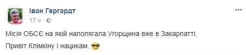 «Речь идет о беспрецедентной активности вражеской агентуры, — заявляет некий Александр Гаврош из Ужгорода, — которая со скрытой фазы деятельности уже переходит в открытую... Для возмущения ситуации кремлевские стратеги предлагали В. Путину привлечь венгерскую сторону, которая также заинтересована в изменении здешней ситуации. Прямо говорилось о сотрудничестве двух стран в проведении диверсионной работы. И это было произнесено не просто так. Ведь сотни тысяч закарпатцев, которые получили гражданство Венгрии, поклялись на верность Будапешту, а это отличная база для проведения любых агентурных операций».