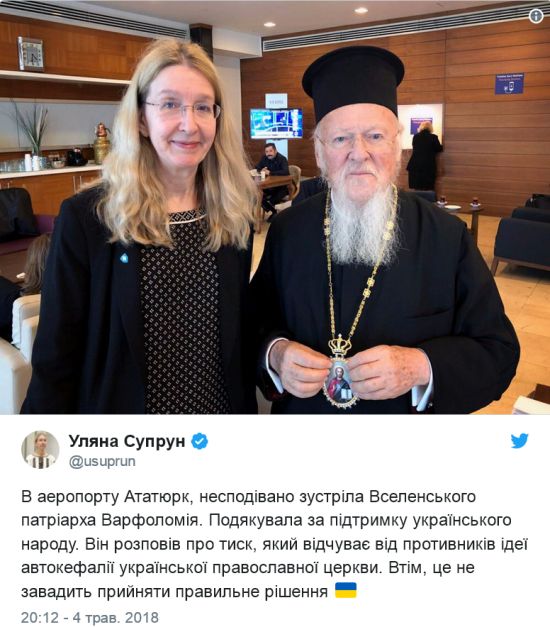 Вот что заявила Супрун после встречи: «В аэропорту Ататюрк, неожиданно встретила Вселенского патриарха Варфоломея. Поблагодарила за поддержку украинского народа. Он рассказал о давлении, которое испытывает от противников идеи автокефалии Украинской православной церкви. Впрочем, это не помешает принять правильное решение».
