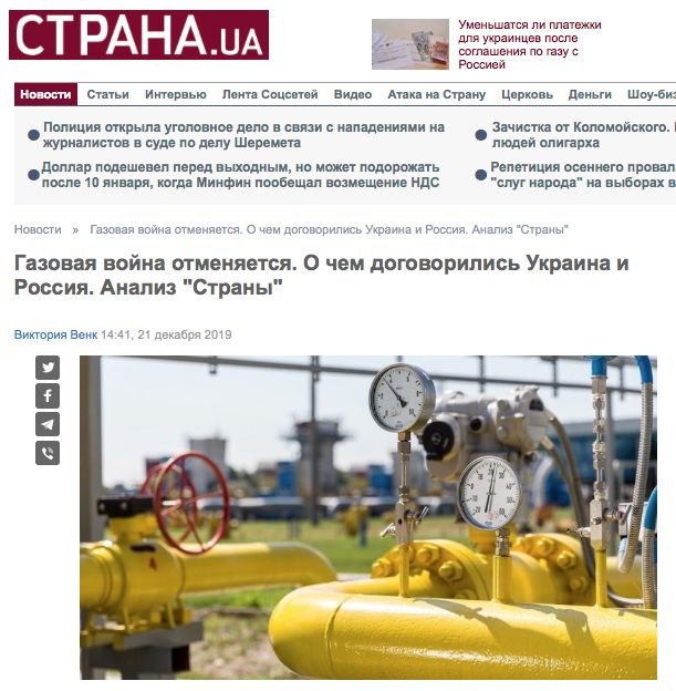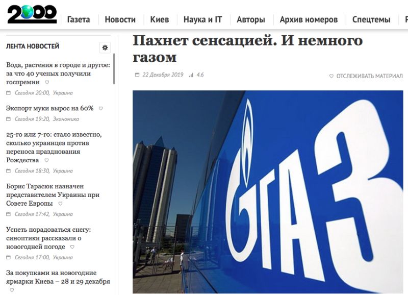 Например, газета «2000» опубликовала заметку Сергея Станкевича «Пахнет сенсацией. И немного газом». (Она вышла после того, как Liga.net и Интерфакс-Украина написали 22 декабря, ссылаясь на свои источники, что несколько неназванных украинских компаний заключили с «Газпромом» контракты на прямые поставки российского газа с 1 января 2020 года).