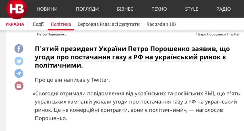 Еще до парижского саммита Петр Пятый предостерегал (!) Зеленского от газовых переговоров во время его проведения. Когда же они состоялись, заявил в своем «Твиттере», что соглашения о поставках газа из РФ на украинский рынок являются политическими. О чем не замедлили раструбить в лояльных к нему СМИ, например на сайте «Нового времени».