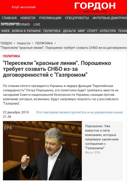 Эту истерику растиражировало также интернет-издание «Гордон». «"Европейская солидарность" (лидером которой является П. Порошенко. – Г.Б.) потребует немедленного созыва заседания Совета национальной безопасности и обороны и введения санкций против прямых поставок газа из России. Уже известно о пяти компаниях, которые напрямую заключили соглашения с «Газпромом», и это не коммерческие, а исключительно политические соглашения», – цитирует «Гордон» слова бывшего хозяина Банковой.