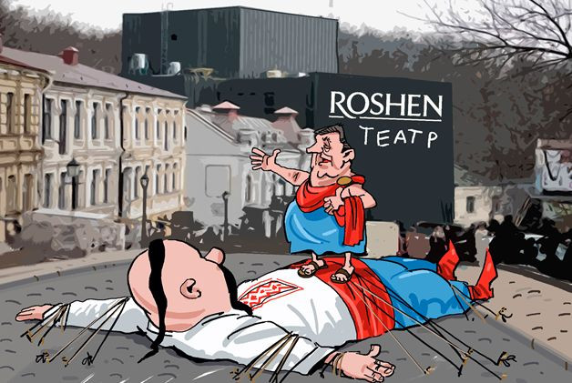 На Андреевском спуске в Киеве появилось весьма спорное в архитектурном смысле здание нового театра. Строительство велось при участии президентской фирмы «Рошен». Сам президент Порошенко, верный своему оригинальному вкусу, разместил у себя в домовой церкви фрески, где он с семьёй изображён в виде римских патрициев. Из ленты новостей.