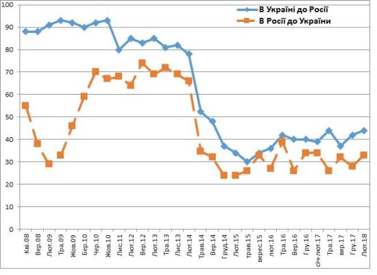 Динамика положительного отношения населения Украины к России и населения России к Украине (% тех, кто относится к другой стране хорошо и очень хорошо)