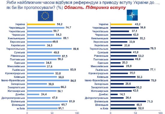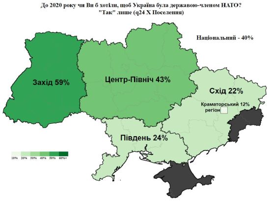 На западе Украины 59% опрошенных хотели бы, чтобы страна до 2020 года стала членом НАТО, на востоке и юге 22% и 24% соответственно, в центре и на севере 42%.