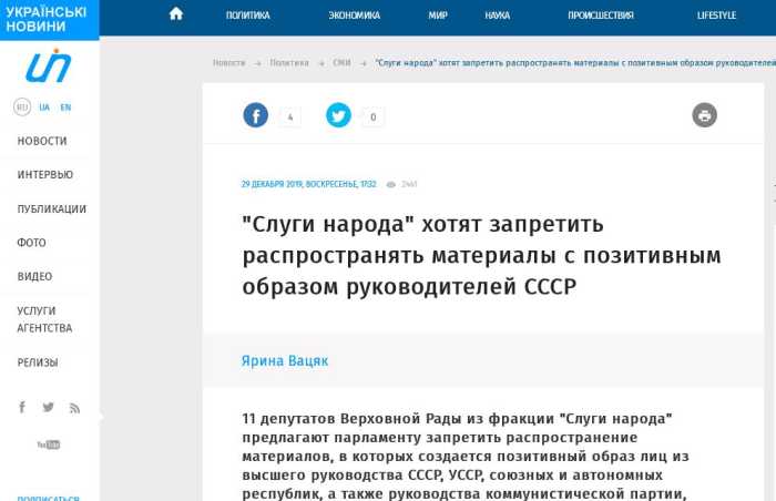 Более того, 11 депутатов украинского парламента из фракции Владимира Зеленского «Слуга народа» уже в самом конце декабря подали законопроект, где предлагается запретить распространение материалов, в которых создается позитивный образ лиц из высшего руководства СССР, УССР, союзных и автономных республик, а также руководства Компартии, начиная от должности секретаря районного комитета, а также работников советских органов госбезопасности. Также собираются запретить распространять информацию, в которой отрицается преступный характер коммунистического режима на Украине в 1917-1991, планируют запретить и позитивное освещение работы российских органов власти! Получается, что люди, избранные под вывеской партии Зеленского, построившего всю свою избирательную кампанию на критике политики Порошенко, продолжают эту политику в самых худших её проявлениях. Ососбенно в части так называемой декоммунизации – абсурднейшего отрицания советского прошлого Украины – УССР.