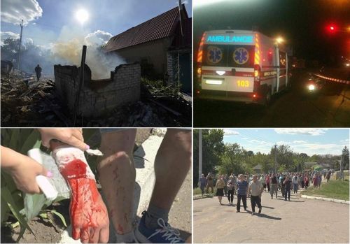 Кровоточащие раны Украины. Один день из ее жизни, 24 мая. Поврежденный обстрелами дом в Авдеевке. Убийство мотоциклиста в Киеве, на месте ЧП. Конфликт под Кировоградом, люди в камуфляже обстреляли селян.