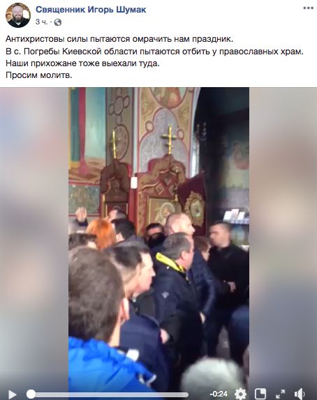 «Антихристовы силы пытаются омрачить нам праздник. В с. Погребы Киевской области пытаются отбить у православных храм. Наши прихожане тоже выехали туда. Просим молитв», – написал священник Игорь Шумак в социальной сети Facebook, сообщая о попытке захвата Свято-Успенского храма Украинской православной церкви (МП). в Киевской области (село Погребы).