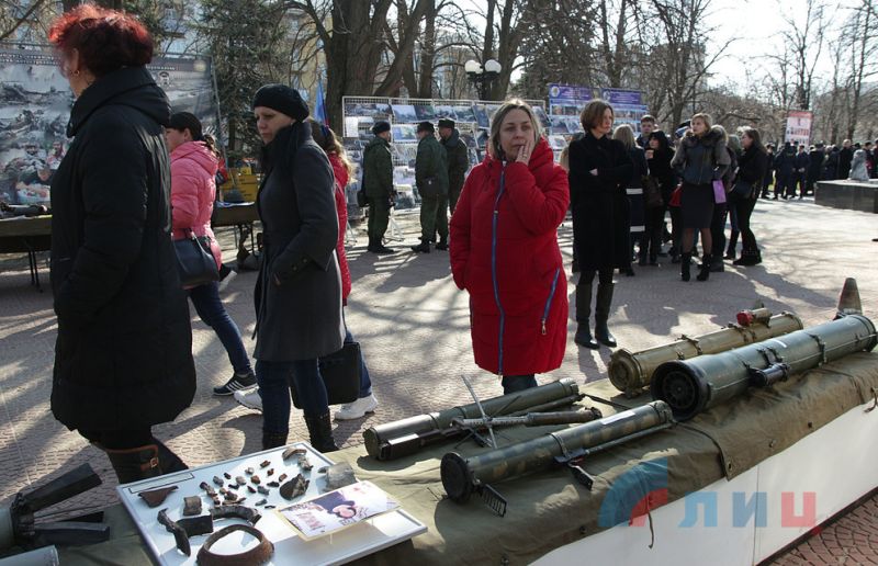Накануне выходных в центре Луганска в сквере Героев Великой Отечественной войны открылась выставка «Нас не поставить на колени». Экспонаты выставки рассказывают о преступлениях украинской власти против народа Донбасса.