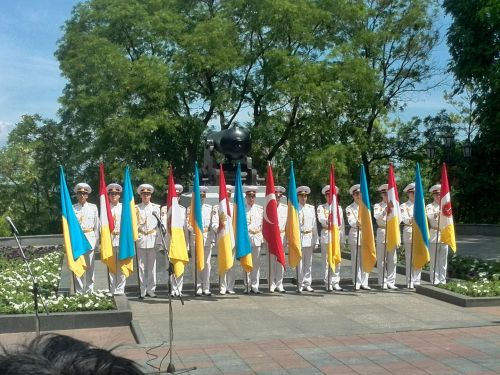 Первое, что бросилось в глаза одесситам — это живой забор из мальчишек-курсантов, которые с флагами Украины и Турции заслонили собой пушку-памятник на Приморском бульваре Одессы. Памятник посвящён успешному отражению нападения англо-французской эскадры на Одессу во время Крымской войны 1853—1855 годов. Он был открыт был в 1904 году.
