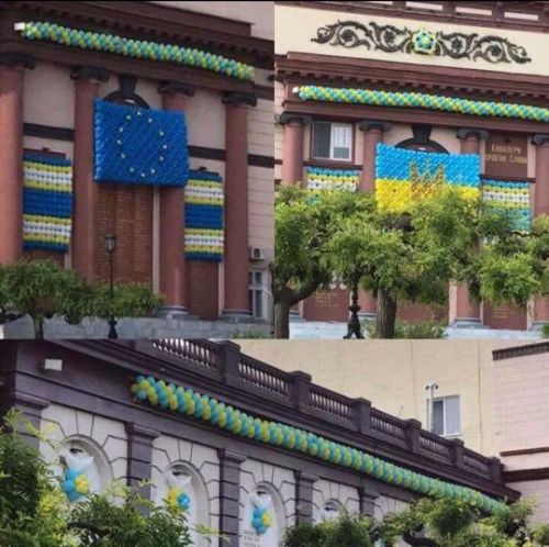 Ещё один повод для насмешек у одесситов появился, когда они увидели, что власть сделала со стеной, на которой запечатлены имена Героев Советского Союза и кавалеров орденов Славы. К приезду Порошенко стену возле Оперного театра закрыли шариками с патриотической расцветкой и флагами Украины.