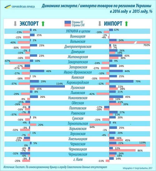 «Европейская правда» пишет: «Доля экспорта в СНГ не только остается высокой в восточных приграничных областях (кроме Донбасса), но и растет в одной из них - на Черниговщине… Гораздо больше удивляет другое - рост импорта из СНГ на 34%. В частности, в Волынской области этот импорт вырос более чем в 8 раз (!), в Черкасской области более чем вдвое, а в Черновицкой на 86%. В прошлом году Украина ввела ограничения на импорт ряда товаров из РФ. Как результат, поставки из России упали почти на треть - на 31,3%. Зато растет импорт из других стран-членов ЕАЭС: из Беларуси (на 13,4%), Армении (11,4%) и Казахстана (15%). Ухудшение торгового сальдо с регионом СНГ - проблема, ответ на которую нужно дать как можно скорее». Не пишут, но, видимо, хотят чуть ли не команду блокаторов имени Семенченко-Парасюка позвать.