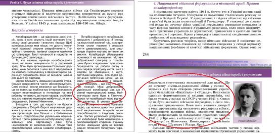 «Авторы учебника убеждают наших учеников, что ярчайшими «проявлениями коллаборационизма» с нацистами были украинские подразделения «Нахтигаль», «Роланд» и, конечно, дивизия «Галичина» А портрет Р. Шухевича даже «достойный» иллюстрирует это явление», - возмущается Грицькив.