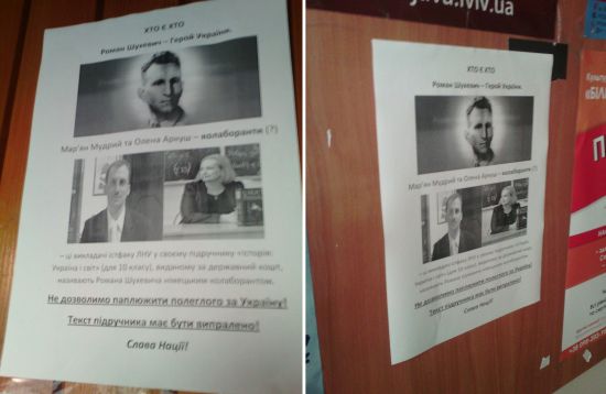 В Львовском национальном университете им. Ивана Франко неизвестные развешали листовки с изображениями преподавателей кафедры новейшей истории Украины Марьяна Мудрого и Елены Аркуши с текстом: «Кто есть кто? Роман Шухевич – Герой Украины. Марьян Мудрый и Елена Аркуша – коллаборанты(?). Эти преподаватели истфака ЛНУ в своем учебнике «История Украины и мир» для 10 класса, изданного за державные средства, называют Романа Шухевича немецким коллаборантом. Не дозволим позорить погибшего за Украину! Текст учебника будет исправлен»! Слава Нации!».