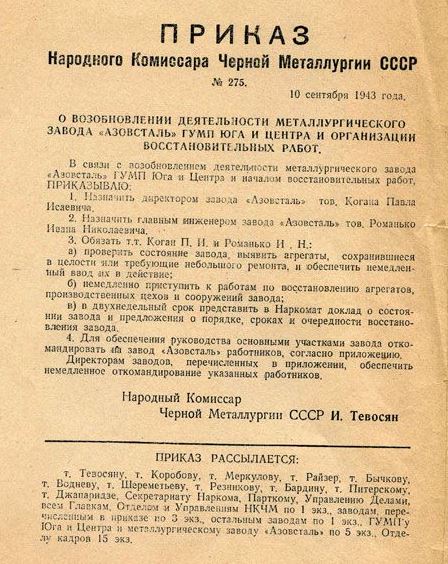 «Назначить директором завода «Азовсталь» тов. Когана, главным инженером – тов. Романько. Обязать тт. Когана и Романько (…) немедленно приступить к работам по восстановлению агрегатов, производственных цехов и сооружений, (…) в двухнедельный срок представить в Наркомат доклад о состоянии завода и предложения о порядке, сроках и очерёдности его восстановления, для обеспечения руководства основными участками немедленно откомандировать на завод «Азовсталь» работников согласно приложению».