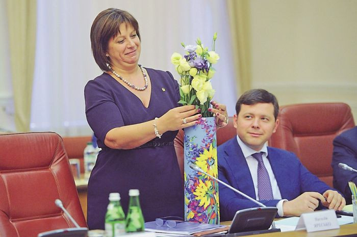 На фото. За «победу на финансовом фронте» Наталья Яресько получила в подарок от министра внутренних дел Арсена Авакова декоративно расписанную гильзу от снаряда из зоны АТО (apostrophe.ua)