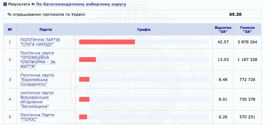 Первое место по партийным спискам получает президентская партия «Слуга народа», набирая 42-43% – больше всех остальных проходных партий, вместе взятых. Зеленскому удалось продавить внеочередные выборы летом, а его сторонники не успели разочароваться в новоизбранном президенте и его команде.