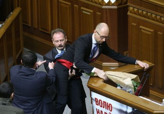 После упоминания фамилии Демчишина народный депутат Олег Барна (БПП) решил проверить физические кондиции премьера. Дальше произошла привычная для стен Верховной рады потасовка между депутатами. Непривычным было то, что дрались депутаты премьерской фракции «Народный фронт» и президентской силы «Блок Петра Порошенко», составляющие остов правящей коалиции.