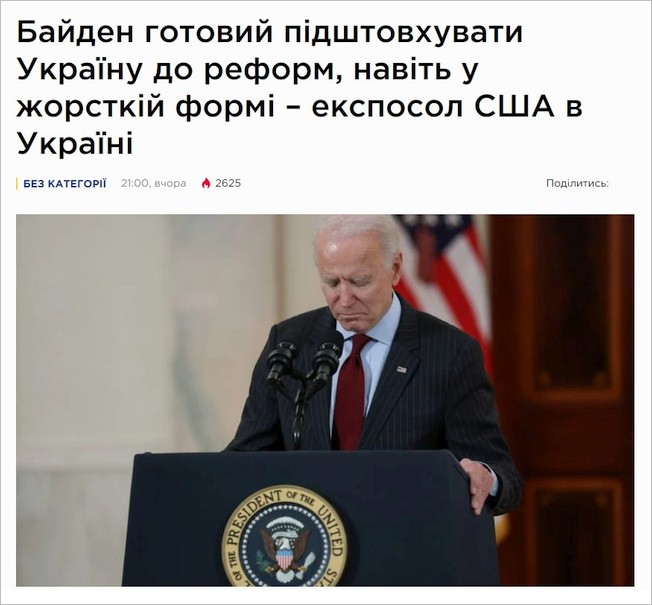 Зеленский уверял коллегу, что «не ощущает никакой напряжённости в отношениях Украины и США». Зря не ощущает, ведь пока Байден молчит, заговорил экс-посол США Стивен Пфайфер: он сообщил, что Байден готов подталкивать Украину к реформам даже в жёсткой форме. Как говорится, будут бить и, возможно, ногами. Так что Вашингтон будет требовать реформ и, конечно, учитывать позицию Москвы.