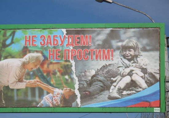 На Донбассе запомнили эти слова. Вдоль городских улиц можно увидеть рекламные щиты, на которых вместо рекламы – плакат с надписью: «Не забудем! Не простим!», разделенный надвое. На одной его половине сидят школьники за партами; на другой – испуганные детишки, забившиеся в темный подвал в надежде спастись от украинских бомбежек.