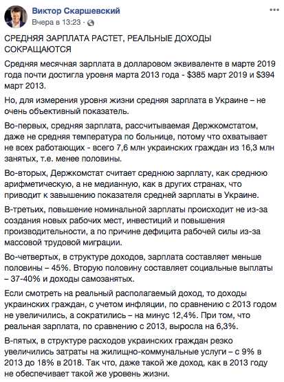 Если даже согласиться, что в среднем зарплата почти догнала довоенный курс 2013-го (тогда доллар стоил примерно 8 грн, а теперь – около 27 грн), когда средним заработком были $410, то теперь её приравнивают к $385. Однако, как объяснил экономист Виктор Скаршевский, во-первых, украинский Держкомстат хитро считает, во-вторых, реальные доходы населения не растут, а, наоборот, падают. «Так что даже такой же доход, как в 2013 году не обеспечивает такой же уровень жизни», – резюмирует он.