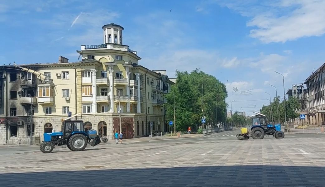 В Мариуполе приступили к отмывке дорожного покрытия, на котором за время боевых действий скопились килограммы сажи и копоти.